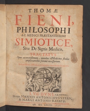 Thomæ Fieni Simiotice Sive de signis medicis tractatus : opus accuratißimum, omnibus Medicinæ studia amplexantibus summè necessarium ; in duas Partes divisum, cum Indicibus nova methodo paratis / Thomas Feyens