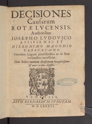 Decisiones Causarum Rotæ Lvcensis : Omnibus Legum professoribus ac in foro versantibus necessariæ ; cum indice omnium decisionum locupletißimo et miro ordine digesto / authoribus Josepho Ludovico Assiensi, et Hieronymo Magonio Urbevetano