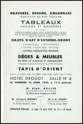 Gravures, dessins, aquarelles : des XVIIIe et XIXe siècles : tableaux anciens et modernes : par ou attribués à: Grebber, van Swanevelt, Lorenzo Tiepolo, Baubrun, Berghem, A. de Dreux [und weitere] : objets d'art d'Extrême-Orient : céramiques européennes, ivoires, sculptures, cristaux : lustres, cassolettes, bronzes : sièges & meubles en bois de placage et marqueterie d'époque ou de style Louis XV, Louis XVI et Empire : tapis d'Orient : dont la vente aux enchères publiques aura lieu à Paris, Hôtel Drouot, Salle No 6 le vendredi 16 avril 1943 / Me Alph. Bellier, commissaire-priseur ; assisté de Jacques Mathey, expert près le Tribunal civil, L.-H. Prost, expert près les douanes françaises