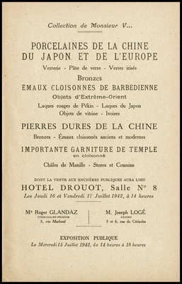 Porcelaines de la Chine, du Japon et de l'Europe : Collection de Monsieur V... : verrerie, pâte de verre, verres irisés : bronzes : émaux cloisonnés de Barbedienne : objets d'Extrême-Orient : laques rouges de Pékin, laques du Japon, objets de vitrine, ivoires : pierres dures de la Chine: bronzes, émaux cloisonnés anciens et modernes : importante garniture de Temple en cloisonné : châles de Manille, stores et coussins : dont la vente aux enchères publiques aura lieu Hôtel Drouot, Salle No 8, les jeudi 16 et vendredi 17 juillet 1942 / Roger Glandaz, commissaire-priseur ; Joseph Logé, expert
