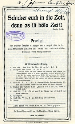 Kriegspredigt von Pfarrer Cantzler, Speyer