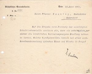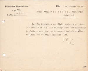 Schreiben Bischöfliches Generalvikariat Trier an Pfarrer Hoenig