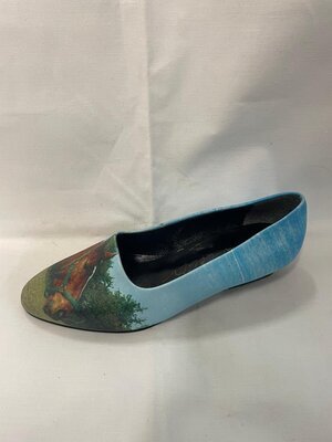 Blauer Pumps mit Pferdekopf-Motiv