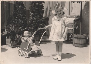 Mädchen im Sommerkleid und Puppenwagen