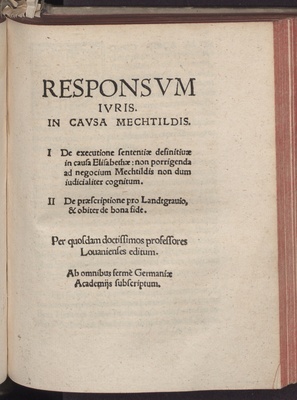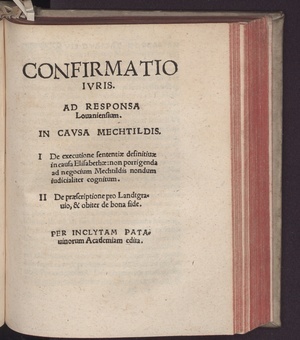 CONFIRMATIO || IVRIS.|| AD RESPONSA || Louaniensium.|| IN CAVSA MECHTILDIS.|| I De executione sententiae definitiuae || in causa Elisabethae: non porrigenda || ad negocium Mechtildis nondum || iudicialiter cognitum.|| II De praescriptione pro Landtgra=||uio, & obiter de bona fide.|| PER INCLYTAM PATA=||uinorum Academiam edita.||