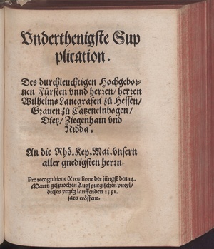 Vnderthenigste Sup||plication.|| Des durchleuchtigen Hochgebor=||nen F[ue]rsten vnnd herren/ herren || Wilhelms Lantgrafen zů Hessen/|| Grauen zů Catzenelnbogen /|| Dietz/ Ziegenhain vnd || Nidda.|| An die Rh[oe]. Key. Mai. vnsern || aller gnedigsten herrn.|| Pro recognitione & reuisione der jüngst den 14.|| Martij gesprochen Augspurgischen vrteyl/|| dieses yetzig lauffenden 1551.|| jars er[oe]ffent.||