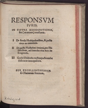 RESPONSVM || IVRIS.|| IN CAVSA RECOGNITIONIS,|| seu (ut uocant) reuisionis.|| I De feudis Herbipolensibus, & pactis || circa ea conuentis.|| II De pactis Vuilhelmi iunioris, per Eli=||sabetham, ueL haeredes eius non in=||fringendis.|| III Quod Elisabetha nullius pactionis be||neficiariae ius acquisierit.|| PER EXCELLENTISSIMVM || D. Marianum Sozinum ||