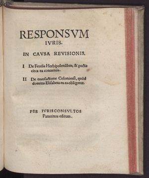 RESPONSVM || IVRIS.|| IN CAVSA REVISIONIS.|| I De Feudis Herbipolensibus, & pactis || circa ea conuentis.|| II De transactione Coloniensi, quod || domina Elisabeta ex ea obligetur.|| PER IVRISCONSVLTOS || Patauinos editum.||