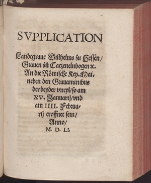 SVPPLICATION || Landtgraue Willhelms zu Hessen/|| Grauen zů Catzenelnbogen [et]c.|| An die R[oe]mische Key. Mai.|| neben den Grauaminibus || der beyder vrteyl/ so am || XV. Januarij/ vnd || am IIII. Februa=||rij eroffnet sein/|| Anno/|| M. D. LI.||