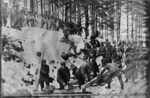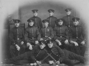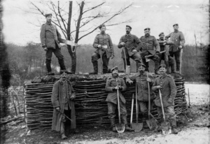 Gruppenaufnahme Pioniere, Baumeister und Joseph Hardt an der freigesprengten Bohrung