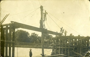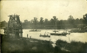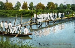 Soldaten beim Bau einer Pionierbrücke über die Isar