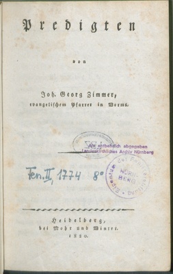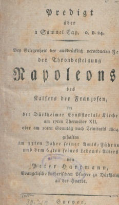 Predigt über 1 Samuel Cap. O, V. 24 : Bey Gelegenheit der ausdrücklich verordneten Feier der Thronbesteigung Napoleons des Kaisers der Franzosen, in der Dürkheimer Consistorial-Kirche am 17ten Thermidor XII. oder am 10ten Sonntag nach Trinitatis 1804 / gehalten im 33ten Jahre seiner Amts-Führung und dem 64ten seines Lebens-Alters von Peter Hartmann, Evangelisch-Lutherischem Pfarrer zu Dürkheim an der Haardt