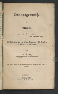 Synagogenweihe in Gießen am 31. Mai 1867 (26. Ijar 5627) : Abschiedsrede in der alten Synagoge, Weihegebete und Predigt in der neuen / von Dr. Levi, Großherzoglichem Rabbiner der Provinz Oberhessen