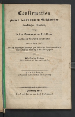 Confirmation zweier taubstummen Geschwister israelitischen Glaubens, vollzogen in der Synagoge zu Friedberg am Sabbath Aehre-Moth und Kedoschim (den 27. April 1844) / von Dr. Levi zu Gießen, Großh. Rabbiner der Provinz Oberhessen