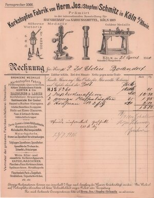 Rechnung der Korkenstopfen Fabrik Schmitz in Köln vom 25. 04.01900