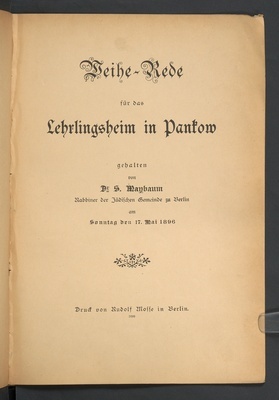 Weihe-Rede für das Lehrlingsheim in Pankow am Sonntag den 17. Mai 1896 / gehalten von Dr. S. Maybaum (Rabbiner der Jüdischen Gemeinde zu Berlin)