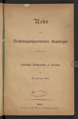 Rede des Reichstagsabgeordneten Bamberger gehalten im Deutschen Reichsverein zu Dresden am 22. Februar 1876