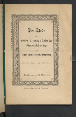 Fest-Rede zur vierten Stiftungs-Feier der Mendelssohn-Loge / von Lehrer Moritz Spanier, Magdeburg