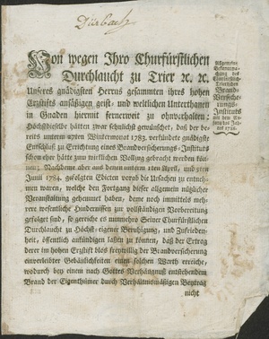 Von wegen Ihro Churfürstlichen Durchlaucht zu Trier [et]c. [et]c. Unseres gnädigsten Herrns gesammten ihres hohen Erzstifts ansäßigen geist- und weltlichen Unterthanen in Gnaden hiermit fernerweit zu ohnverhalten: Höchstdieselbe hätten zwar sehnlichst gewünschet, daß der .... Entschluß zu Errichtung eines Brandversicherungs-Instituts schon eher hätte zum wirklichen Vollzug gebracht werden können .... / [Clemens Wenceslaus Churfürst]. Ex Mandato Serenissimi Elector. Speciali J. L. Schaeffer