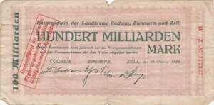 Hundert Milliarden Mark Kassenschein der Landkreise Cochen, Simmern und Zell von 1923