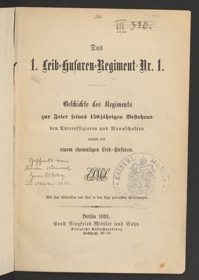 Das 1. Leib-Husaren-Regiment Nr. 1 : Geschichte des Regiments zur Feier seines 150jährigen Bestehens den Unteroffizieren und Mannschaften erzählt von einem ehemaligen Leib-Husaren [d. i. August von Mackensen]