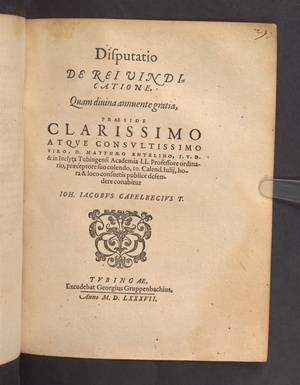 Disputatio DE REI VINDICATIONE, Quam ... PRAESIDE ... D. MATTHAEO ENTZLINO, I.V.D. & in Inclyta Tubingensi Academia LL.Professore ordinario, praeceptore suo colendo, 10.Calend.Iulij, hora & loco consuetis publicè defendere conabitur IOH. IACOBVS CAPELBECIVS T.