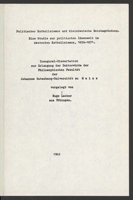 Politischer Katholizismus und kleindeutsche Reichsgründung : eine Studie zur politischen Ideenwelt im deutschen Katholizismus, 1859-1871 / vorgelegt von Hugo Lacher