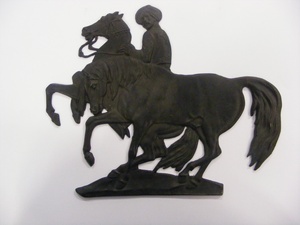 Reiter mit Zusatzpferd reitet durch Toreinfahrt