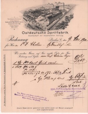 Rechnung der Ostdeutschen Spritfabrik in Berlin vom 9. Mai 1902 an Peter Josef Cholin in Bodendorf/Ahr