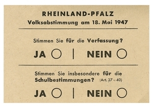 Stimmzettel zur Volksabstimmung in Rheinland-Pfalz über die Verfassung des Landes und die Schulartikel