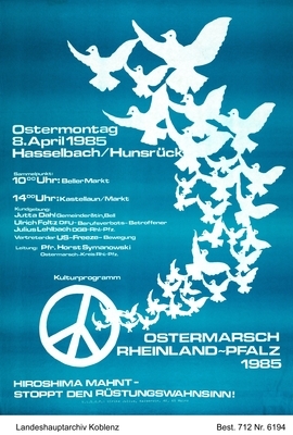"Ostermarsch 8. April Rheinland-Pfalz Hasselbach/Hunsrück...Hiroshima mahnt - stoppt den Rüstungswahnsinn" - Ostermarsch Rheinland-Pfalz 1985