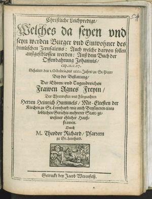 Christliche Leichpredigt/ Welches da seyen vnd seyn werden Burger vnd Einwohner des himlischen Jerusalems: Auch welche darvon sollen außgeschlossen werden: Auß dem Buch der Offenbahrung Johannis ... : Gehalten den 2. Octobris, des 1660. Jahrs/ zu St. Peter/ Bey der Bestattung/ Der ... Frawen Agnes Freyin/ Des ...Herren Heinrich Hummels ... gewesener ehlicher Haußfrawen. / Durch M. Theodor Richard/ Pfarrern zu St. Leonhard.