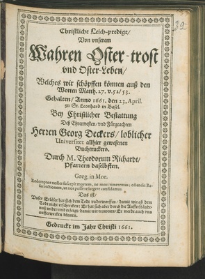 Christliche Leich-predigt/ Von vnserem Wahren Oster-trost vnd Oster-Leben : Welches wir schöpffen k[oe]nnen auß den Worten Matth. 27. v. 52/53. Gehalten/ Anno 1661. den 23. April. zu St. Leonhard in Basel. Bey Christlicher Bestattung Deß ... Herren Georg Deckers/ loblicher Universitet allhier gewesenen Buchdruckers. / Durch M. Theodorum Richardt/ Pfarrern daselbsten