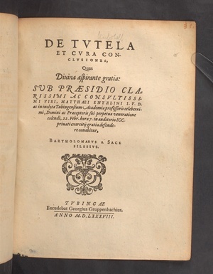 DE TVTELA ET CVRA CONCLVSIONES, Quas ... SVB PRAESIDIO ... MATTHAEI ENTZLINI I.V.D. ac in inclyta Tubingensium Academia professoris ... 22.Febr. hora 7. in auditorio ICC. priuati exercitij gratia defendere conabitur, BARTHOLOMAEVS A SACK SILESIVS. '