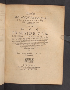 Theses DE ACQVIRENDA VEL OMITTENDA HEREDI-TATE, ET IVre deliberandi. QVAS D.E.G. PRAESIDE ... DOMINO MATTHAEO ENTZlino I.V.Doctore, eiusdemq́; in celeberrima Tubigensium Academia Professore celeberrimo, tunc temporis Rectore Magnifico ... ad diem I.Nouembris priuati exercitij causâ pro ingenij sui tenuitate defendere conabitur, BARTHOLOMAEVS A ̀SACK SILESIVS.