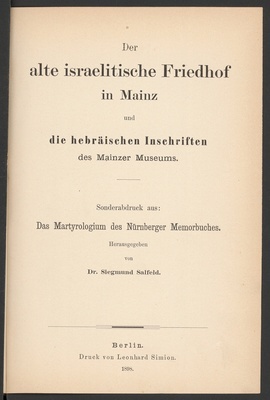 Der alte israelitische Friedhof in Mainz und die hebräischen Inschriften des Mainzer Museums : Sonderabdruck aus: Das Martyrologium des Nürnberger Memorbuches / herausgegeben von Dr. Siegmund Salfeld