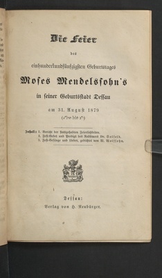 Die Feier des einhundertfünfzigsten Geburtstages Moses Mendelssohn's in seiner Geburtsstadt Dessau am 31. August 1879 : Bericht der stattgehabten Feierlichkeiten, Fest-Gebet und Predigt, Fest-Gesänge und Lieder / Dr. Salfeld, W. Wolfsohn