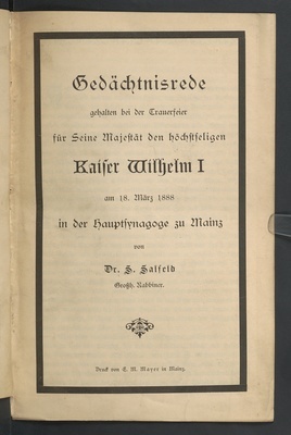 Gedächtnisrede gehalten bei der Trauerfeier für Seine Majestät den höchstseligen Kaiser Wilhelm I am 18. März 1888 in der Hauptsynagoge zu Mainz / von Dr. S. Salfeld (Großh. Rabbiner)