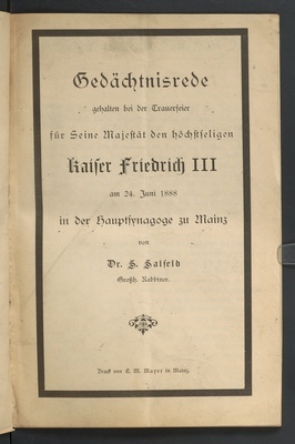 Gedächtnisrede gehalten bei der Trauerfeier für Seine Majestät den höchstseligen Kaiser Friedrich III am 24. Juni 1888 in der Hauptsynagoge zu Mainz / von Dr. S. Salfeld (Großh. Rabbiner)