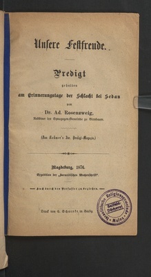 Unsere Festfreude : Predigt gehalten am Erinnerungstage der Schlacht bei Sedan / von Dr. Ad. Rosenzweig, Rabbiner der Synagogen-Gemeinde zu Birnbaum