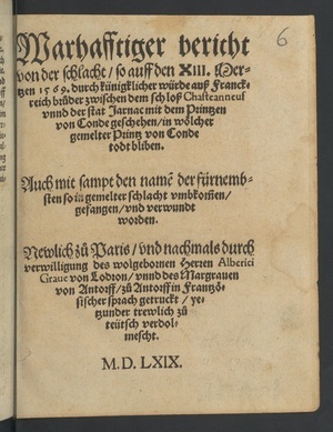 Warhafftiger Bericht von der Schlacht, so auff den XIII. Mertzen 1569 : durch künigklicher würde auß Franckreich Bruder, zwischen dem Schloss Chasteanneuf, unnd der Stat Jarnac, mit dem Printzen von Condé geschehen, in wölcher gemelter Printz von Condé todt bliben ; auch mit sampt den Name der Fürnembsten, so in gemelter Schlacht umbkommen, gefangen, und verwundt worden ; newlich zu Paris ... in französischer sprach getruckt, jetzunder trewlich zu Teutsch verdolmetscht
