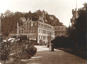 Blick auf Schlossgärtnerei, Schloss und Burgruine Sayn