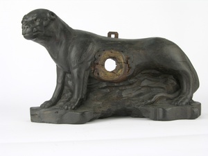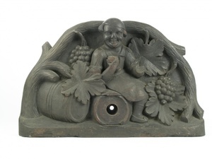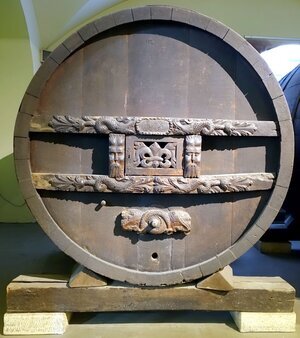 Fassriegel mit lachendem Kellermeister auf Weinfass
