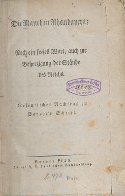 Die Mauth in Rheinbayern; Noch ein freies Wort, auch zur Beherzigung der Stände des Reichs : Wesentlicher Nachtrag zu Savoye's Schrift