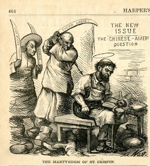 The martyrdom of St.Crispin : zwei Chinesen greifen hinterrücks St. Crispin an, den Schutzpatron der Schuster / Th. Nast
