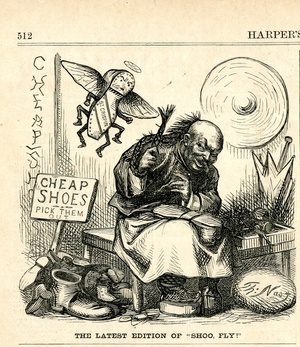 The latest edition of "Shoo, fly!" : ein chinesischer Schuster versucht eine Fliege zu verjagen, die St.Crispin, den Schutzpatron der Schuhmacher darstellt / Th. Nast