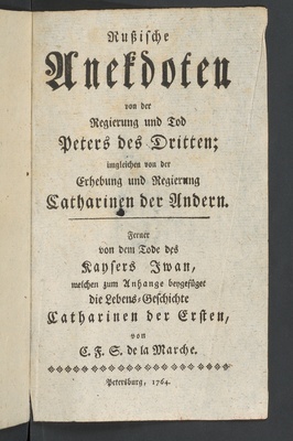 Rußische Anekdoten von der Regierung und Tod Peters des Dritten; imgleichen von der Erhebung und Regierung Catharinen der Andern : Ferner von dem Tode des Kaysers Iwan, welchen zum Anhange beygefüget die Lebens-Geschichte Catharinen der Ersten / von C. F. S. de la Marche