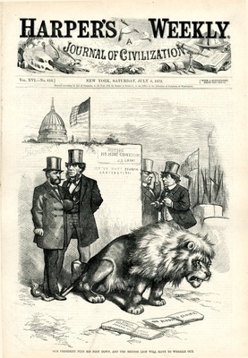 Our President puts his foot down, and the British Lion will have to wriggle out : Grant tritt dem britischen Löwen auf den Schwanz / Th. Nast