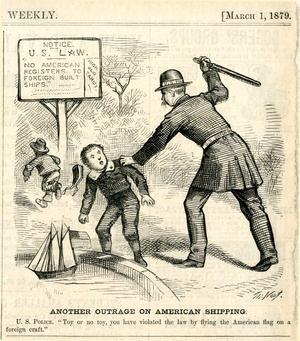 Another outrage on american shipping. U.S. police. "Toy or no toy, you have violated the law by flying the American flag on a foreign craft." : ein Polizist verhaftet einen kleinen Jungen, der mit einem Segelschiff an einem Teich spielt / Th. Nast