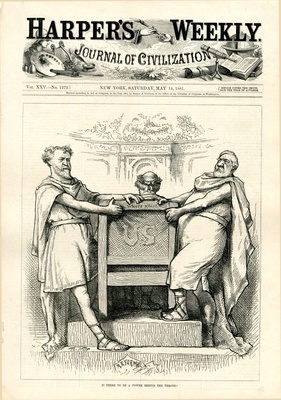 Is there to be a power behind the throne? : Roscoe Conkling und James Blaine sind als römische Senatoren gekleidet und stehen im Weißen Haus hinter dem Sessel des Präsidenten / Th. Nast